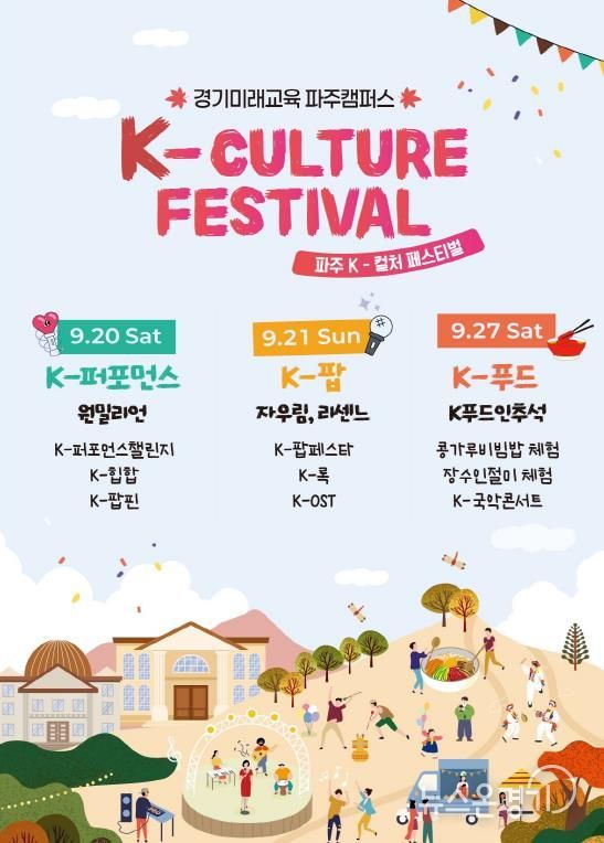 행사는 경기미래교육파주캠퍼스(구 파주 영어마을)에서 진행되며 ▲20일 K-퍼포먼스 ▲21일 K-POP ▲27일 K-푸드 등 회차마다 차별화된 테마로 방문객에게 다양한 한류문화 체험 경험을 제공할 예정이다.