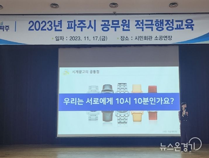 뉴스온경기 한민규 기자 | 파주시는 지난 17일 시민회관 소공연장에서 시민이 일상에서 확실한 변화를 체감할 수 있는 적극행정 문화 정착을 위해 600여 명의 직원을 대상으로 ‘2023년 적극행정 직원 교육’을 실시했다.