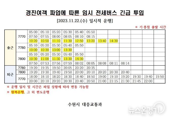 수원시는 출퇴근 시간에 맞춰 전세버스 50대를 투입해 7770번(수원역~사당역), 7780번(능실마을21단지~사당역), 7800번(서부공영차고지~사당역) 3개 노선(총 86회)을 운영할 계획이다.
