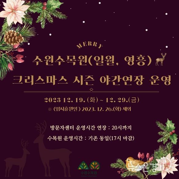 뉴스온경기 한민규 기자 | 수원시가 크리스마스 시즌을 맞아 19일부터 29일까지 수원수목원(일월·영흥수목원) 방문자센터를 연장 운영한다.