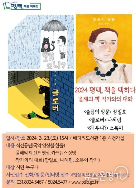 17년째를 맞이하는 ‘평택, 책을 택하다’ 올해의 책은 장일호의 '슬픔의 방문', 나혜림의 '클로버', 소복이의 '왜 우니?'로 작가와의 대화를 통해 이날 시민들과 첫 만남의 자리를 갖게 된다.