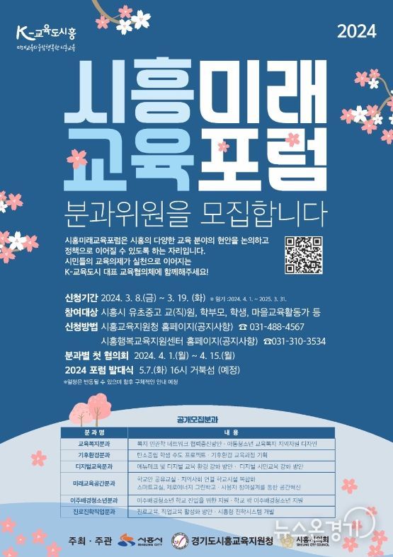 뉴스온경기 | 경기도시흥교육지원청와 시흥시, 시흥시의회는 시흥지역의 교육공동체 간 소통과 협업을 통한 교육의제를 발굴하고 정책으로 연계하는 민·관·학 지역교육협의체 ‘2024 시흥미래교육포럼’의 분과위원을 3월 8일부터 3월 19일까지 공개 모집한다.