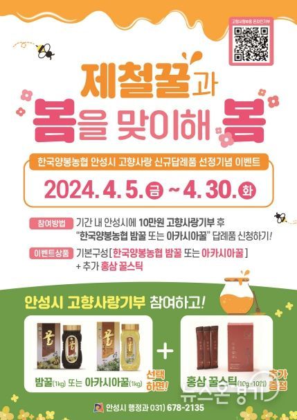 뉴스온경기 | 안성시가 고향사랑기부제 답례품으로 새롭게 선정된 한국양봉농협의 밤꿀 또는 아카시아꿀을 오는 4월 5일부터 한달간 파격 제공한다고 4일 밝혔다.