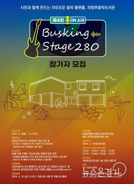 뉴스온경기 | 의정부시는 아마추어 지역 음악인의 성장을 지원하는 ‘제4회 버스킹 stage 280’을 의정부음악도서관에서 개최한다.