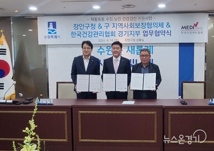 뉴스온경기 | 수원시 장안구는 지난 16일, 장안구 지역사회보장협의체, 한국건강관리협회 경기도지부와 ‘장안구 재활용품 수집 노인 건강검진’을 위한 업무협약을 체결했다.