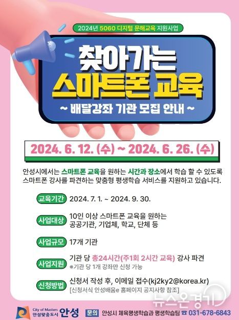 신청은 6월 10일부터 선착순 접수로 안성시 홈페이지 또는 안성배움e홈페이지에서 찾아가는 스마트폰 교육 배달강좌 신청서를 작성한 뒤 이메일로 제출하면 된다.
