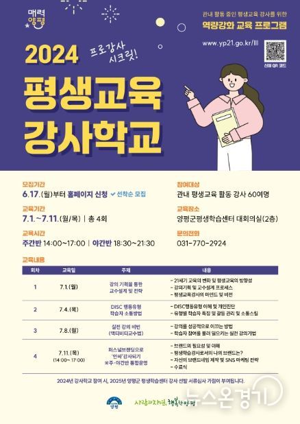 뉴스온경기 | 양평군은 ‘프로강사 시크릿! 2024 평생교육 강사학교’ 교육에 참여할, 관내에서 활동하고 있는 평생교육 강사를 오는 17일부터 선착순 모집한다고 밝혔다.