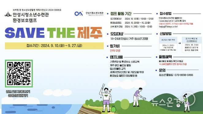 뉴스온경기 | 안성시청소년수련관에서는 9월 10일 화요일부터 안성시 관내 중·고·대학생을 대상으로 환경보호캠프 ‘SAVE THE 제주’ 참가자를 모집한다.