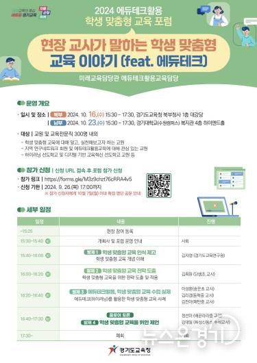 뉴스온경기 | 경기도교육청이 ‘에듀테크활용 학생 맞춤형 교육 포럼’을 오는 16일과 23일 각각 북부청사와 경기대학교에서 개최한다.