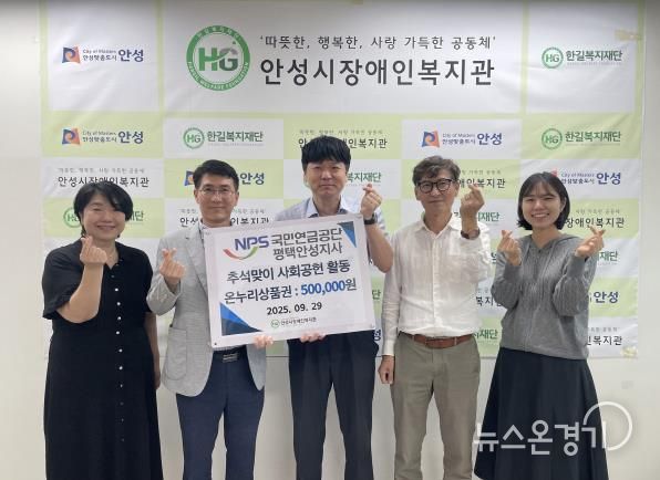 뉴스온경기 | 사회복지법인 한길복지재단에서 수탁하고 있는 안성시장애인복지관은 지난 9월 29일 국민연금공단 평택안성지사로부터 사회공헌활동으로 50만원 상당의 온누리 상품권을 후원받았다고 밝혔다.