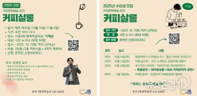 뉴스온경기 | 시흥시는 민간주도형 지역축제 지원사업인 ‘2025년 시흥시 지역특화 관광축제 지원사업’에 선정된 ‘세계 커피콩 축제’의 사전 연계 프로그램으로 커피문화예술 특강 ‘커피살롱’을 오는 10월 14일부터 11월 4일까지 시흥ABC행복학습타운 지혜관에서 총 4회에 걸쳐 진행한다.
