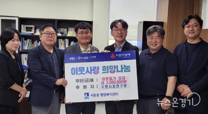 뉴스온경기 | 수원시정연구원과 수원시정연구원 사우회가 지난 10월 2일, 추석을 맞아 나눔을 실천하고자 성금 200만원을 서둔동 행정복지센터에 기탁했다. 이번 기탁금은 수원시정연구원장과 수원시정연구원 사우회에서 각 100만원을 모아 마련한 것이다.