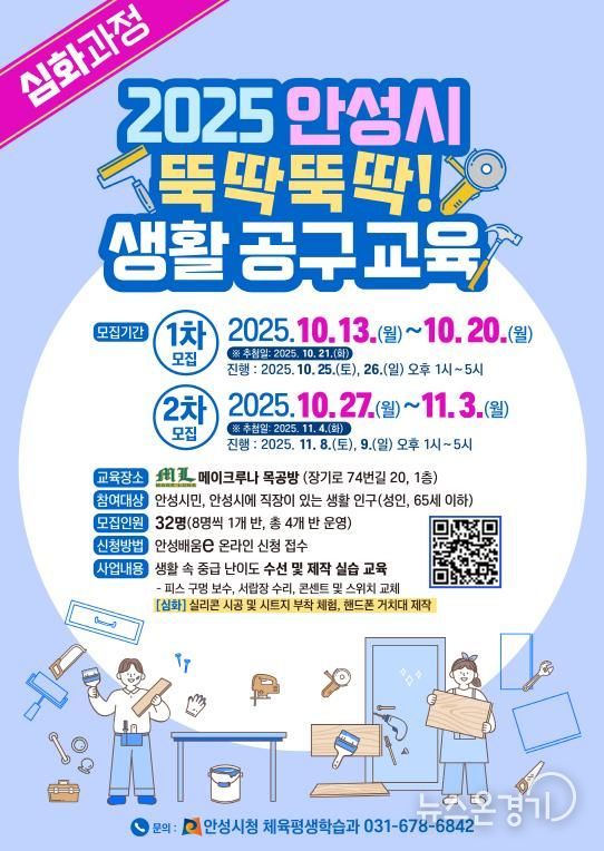 뉴스온경기 | 안성시는 시민들의 생활 자립 역량 강화를 위해 '뚝딱뚝딱 생활 공구[심화과정] 교육'을 오는 10월 25~26일과 11월 8~9일, 총 2회 주말 일정으로 운영한다고 밝혔다.