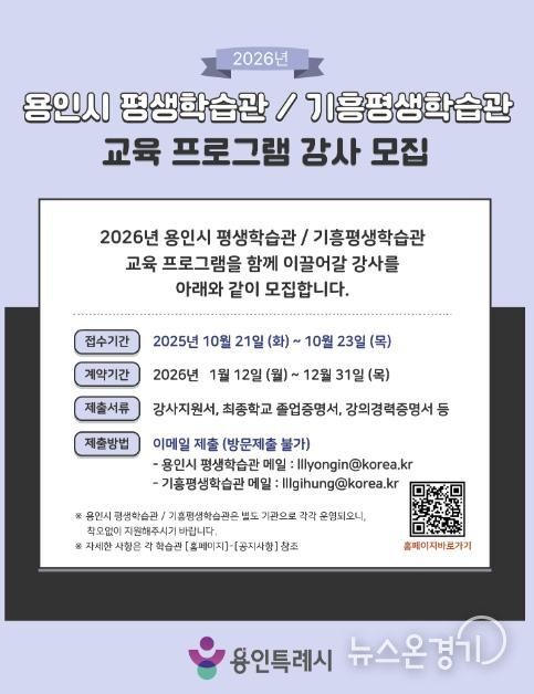 뉴스온경기 | 용인특례시는 21일부터 23일까지 3일간 ‘2026년 평생학습관 프로그램’을 운영할 강사를 모집한다고 15일 밝혔다.