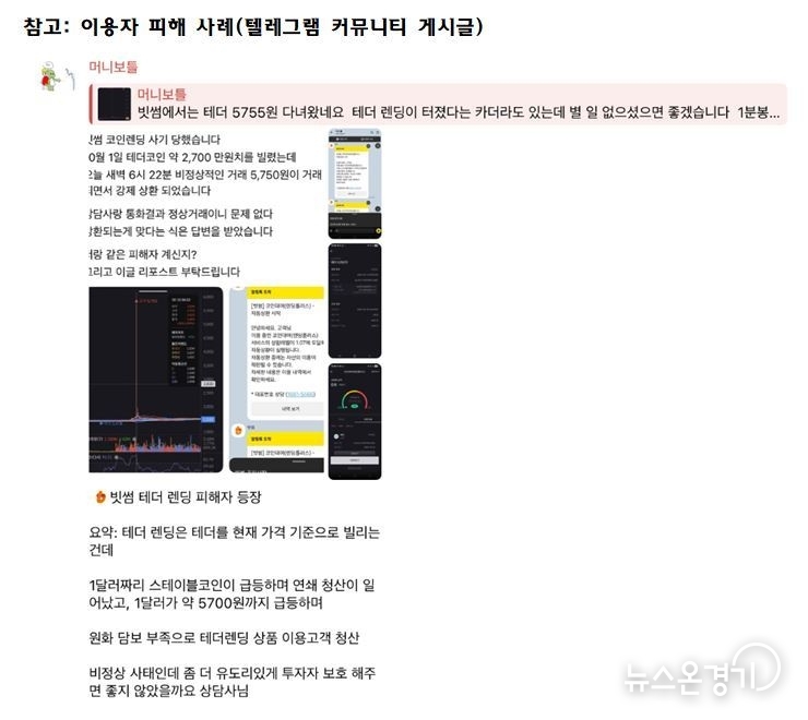 정부와 더불어민주당이 디지털자산TF를 구성하며 건전한 스테이블코인 법제화를 위해 총력을 기울이는 상황에서, 11일(토) 새벽 국내 주요 가상자산 거래소 빗썸에서 달러가격에 연동되어야 할 스테이블코인 테더(USDT)의 가격이 338%(5,755원)까지 폭등하여, 이용자들 대여 자산에 연쇄적인 강제 청산(현물 청산)이 발생하는 초유의 사태가 발생했다.