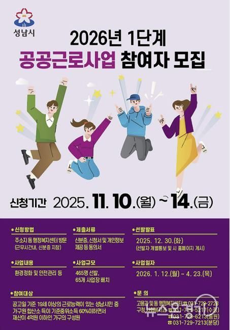 뉴스온경기 | 성남시는 오는 11월 10일부터 14일까지 ‘2026년도 1단계 공공근로사업’ 참여 희망자 465명을 모집한다.