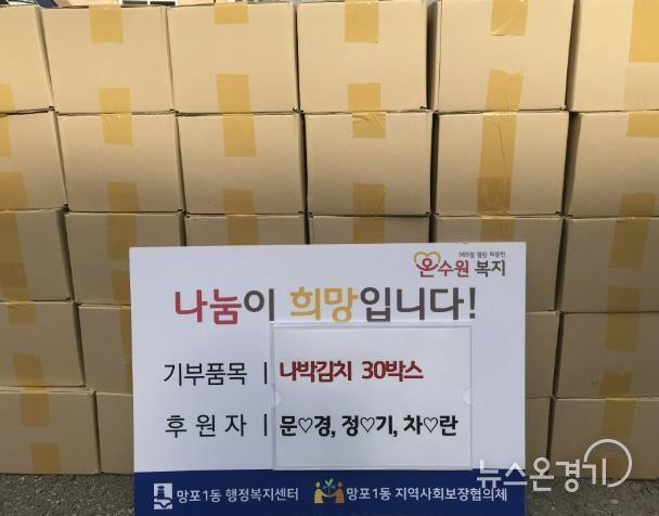 뉴스온경기 | 수원시 영통구 망포1동행정복지센터는 지난 17일, 망포1동 주민 3명이 저소득 취약계층을 위해 나박김치 30박스를 후원했다고 밝혔다.