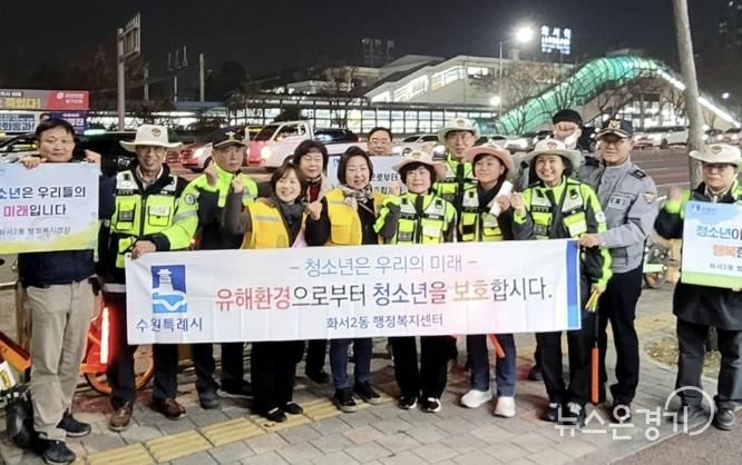 뉴스온경기 | 수원시 팔달구 화서2동은 11월 24일 오후 7시부터 8시까지 관내 청소년 보호를 위한 유해환경 점검 및 계도 캠페인을 펼쳤다. 이번 활동에는 청소년지도위원회, 자율방범대, 화서문지구대 경찰관 등이 참여해 민‧관 협력 체계를 강화하는 데에 뜻을 모았다.