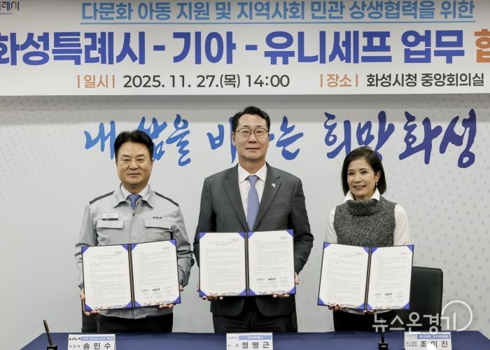 뉴스온경기 | 화성특례시가 27일 시청 중앙회의실에서 유니세프 한국위원회, 기아 주식회사와 ‘다문화아동 지원 및 지역사회 민관 상생 협력을 위한 업무협약’을 체결했다.