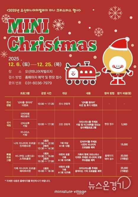 뉴스온경기 | 오산시는 12월을 맞아 ‘미니 크리스마스’ 행사를 오는 12월 6일부터 25일까지 17일간 오산미니어처빌리지에서 개최한다고 밝혔다. 행사는 오전 10시부터 오후 6시까지 진행되며, 크리스마스를 주제로 전 연령이 함께 즐길 수 있는 전시와 체험 프로그램 등 풍성한 콘텐츠가 마련된다.