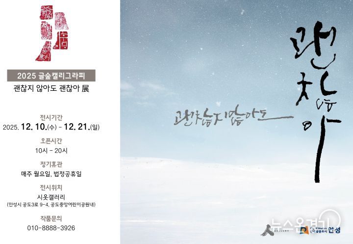 뉴스온경기 | 공도 작은미술관 시옷갤러리는 오는 12월 10일부터 12월 21일까지 글숲 캘리그라피 작가들이 참여하는 전시 ‘괜찮지 않아도 괜찮아’ 전을 개최한다.