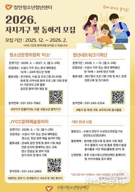 뉴스온경기 | 수원시청소년청년재단 장안청소년청년센터는 2025년 12월 16일부터 청소년 수련시설 및 지역사회의 변화를 이끌어갈 청소년과 청년 지원자를 모집한다.