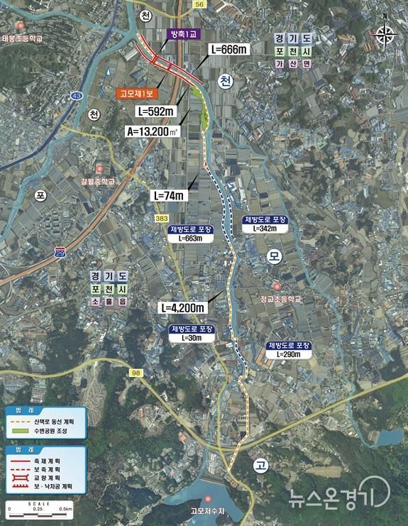 정비사업은 포천시 소흘읍 고모리에서 가산면 일원까지 총 연장 4.1km 구간을 대상으로 추진된다. 하천 제방 1.26km 보강을 통해 고모천의 홍수 대응 능력을 우선 개선하고 하천 유휴지를 활용하여 수변공원과 산책로를 조성해 주민들이 안전하게 이용할 수 있도록 하는 사업이다.