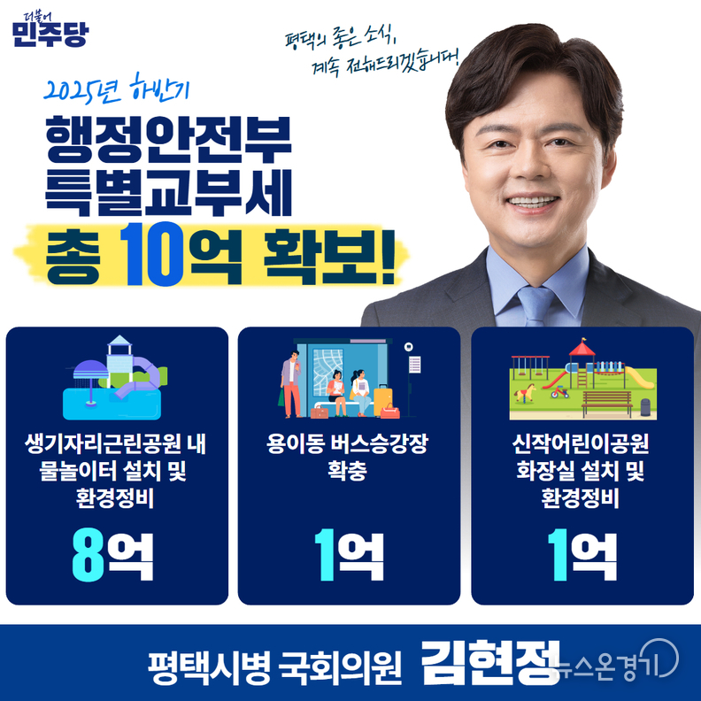 김현정 국회의원(평택시병·더불어민주당)은 2025년 하반기 행정안전부 특별교부세 총 10억 원을 확보해, 지역 주민의 생활환경 개선과 안전·편의 증진을 위한 주요 현안 사업을 본격 추진한다고 밝혔다.