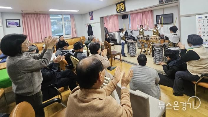 뉴스온경기 | 지난 24일, 수원특례시 영통구 매탄1동은 매탄1동지역사회보장협의체와 함께 현대힐스테이트경로당 자매결연 행사로 The꿈 지역아동센터 아동들이 준비한 난타공연을 선보였다.