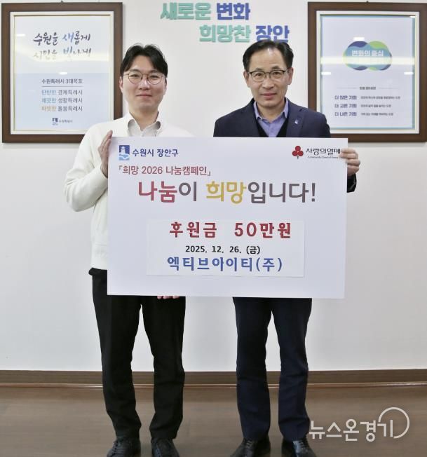뉴스온경기 | 수원시 장안구는 지난 26일 송죽동 소재 엑티브아이티(주)가 기부금 50만 원을 전달했다고 밝혔다. 이번 기부는 장안구 관내 어려운 이웃을 돕기 위한 것으로, 지역사회에 온정을 나누는 뜻깊은 자리다.