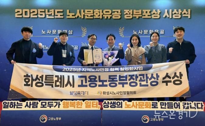 뉴스온경기 | 화성특례시는 지난 30일 고용노동부 주관으로 열린 '2025년 노사문화유공 정부포상 시상식’에서 ‘지역노사민정 협력 유공’단체부문 고용노동부장관 표창을 수상했다고 31일 밝혔다.