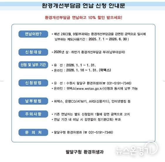 뉴스온경기 | 수원시 팔달구는 환경개선부담금 납부 대상자를 대상으로 1월 31일까지 환경개선부담금 연납 신청을 받는다.