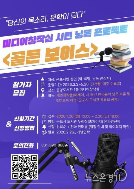 뉴스온경기 | 군포시 중앙도서관은 시민이 직접 참여하는 낭독 콘텐츠 제작을 통해 공공 문화콘텐츠를 확산하고, 시민의 창작 경험을 지원하기 위해 미디어창작실 시민 낭독 프로젝트 '골든 보이스'를 운영한다.