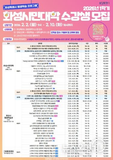 뉴스온경기 | 화성특례시는 2026년 1학기 화성시민대학 수강생을 다음 달 2일부터 10일까지 선착순 모집한다고 27일 밝혔다.