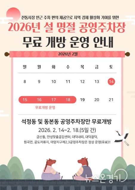 뉴스온경기 | 안성시시설관리공단은 2026년 설 명절을 맞아 2월 14일부터 18일까지 5일간, 공단이 관리하는 공영주차장 중 전통시장 인근에 위치한 석정동 공영주차장과 동본동 공영주차장을 한시적으로 무료 개방한다고 밝혔다.