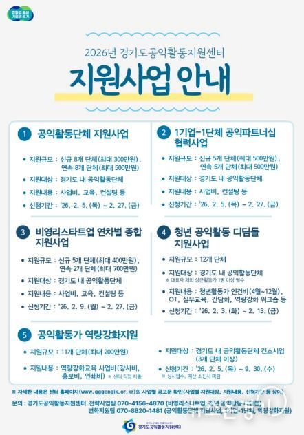 뉴스온경기 | 경기도공익활동지원센터가 ‘2026년 경기도 공익활동 지원사업’에 참여할 도내 공익활동 단체를 모집한다.
