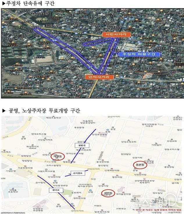 주정차 단속 유예 구간은 안성맞춤시장(서인사거리~인지사거리 구간 양측 300미터)과 중앙시장(서인사거리~안성농협 양측 100미터, 석정삼거리~인지사거리 양측 500미터) 주변 도로이며, 서인동·동본동·석정동의 건축식 공영주차장과 전통시장 주변 노상주차장이 무료 개방된다.