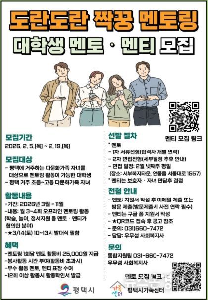 뉴스온경기 | 평택시가족센터는 2월 5일부터 19일까지 다문화가족 자녀 대상 ‘도란도란 짝꿍 멘토링’에 참여할 대학생 멘토와 멘티를 모집한다.
