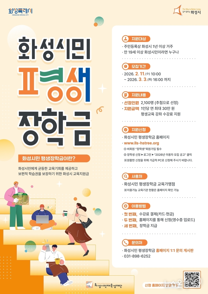 (재)화성시인재육성재단(대표이사 임선일)에서 2026년도 화성시민 평생장학금 이용자를 오는 2월 11일부터 3월 3일까지 21일간 온라인으로 모집한다.