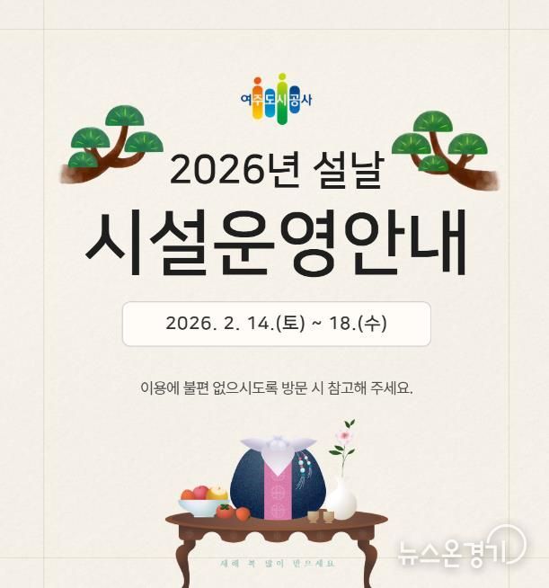 뉴스온경기 | 여주도시공사가 다가오는 2026년 설 연휴를 맞아 시민과 귀성객들이 안전하고 편안한 명절을 보낼 수 있도록 주요 시설 운영시간 조정 및 특별 서비스를 시행한다고 밝혔다.