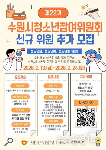 뉴스온경기 | 수원시청소년청년재단(이사장 최종진)은 수원시 청소년의 정책 참여 확대와 권익 증진을 위해 '제22기 수원시청소년참여위원회' 위원을 추가 모집한다고 밝혔다.