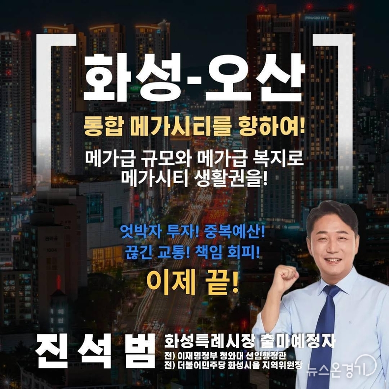 진석범 화성특례시장 출마예정자가 자신의 SNS(페이스북)에 “화성–오산 지자체 통합을 통한 메가시티 논의를 제안합니다.”라는 제목의 글을 포스팅하여 화성특례시와 오산시 간 통합 논의를 제안했다.