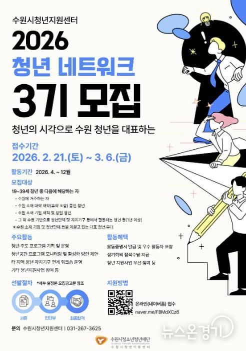 뉴스온경기 | 수원시청소년청년재단 수원시청년지원센터는 2월 21일부터 3월 6일까지 2026년 청년 네트워크 단원 32명을 모집한다.