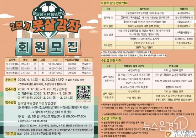뉴스온경기 | 수원시청소년청년재단 칠보청소년청년센터는 지역 청소년들의 건강한 여가 생활과 체력 증진을 위해녪년 2분기 문화강좌(풋살 교실)’수강생을 모집한다고 밝혔다.