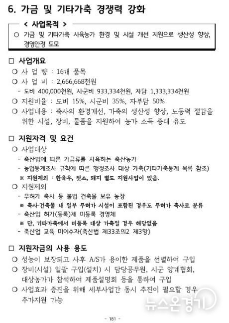 ‘가금 및 기타가축 사육농가 지원사업’은 시설 현대화를 통한 축사 환경 개선, 방역 물품 지원 등을 통한 생산성 향상이 주요 내용이다.