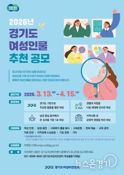 뉴스온경기 | 경기도여성비전센터는 4월 15일까지 ‘2026년 경기도 여성인물’을 모집하고, 선정된 4명의 활동 영상을 전시한다고 13일 밝혔다.