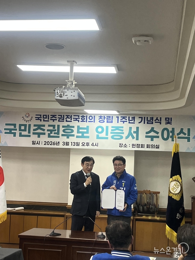 김원기 더불어민주당 의정부시장 예비후보는 지난 13일 국회 헌정기념관에서 열린 『국민주권 전국회의』 창립 1주년 기념식에 참석해 국민주권 후보 인증서를 받았다.