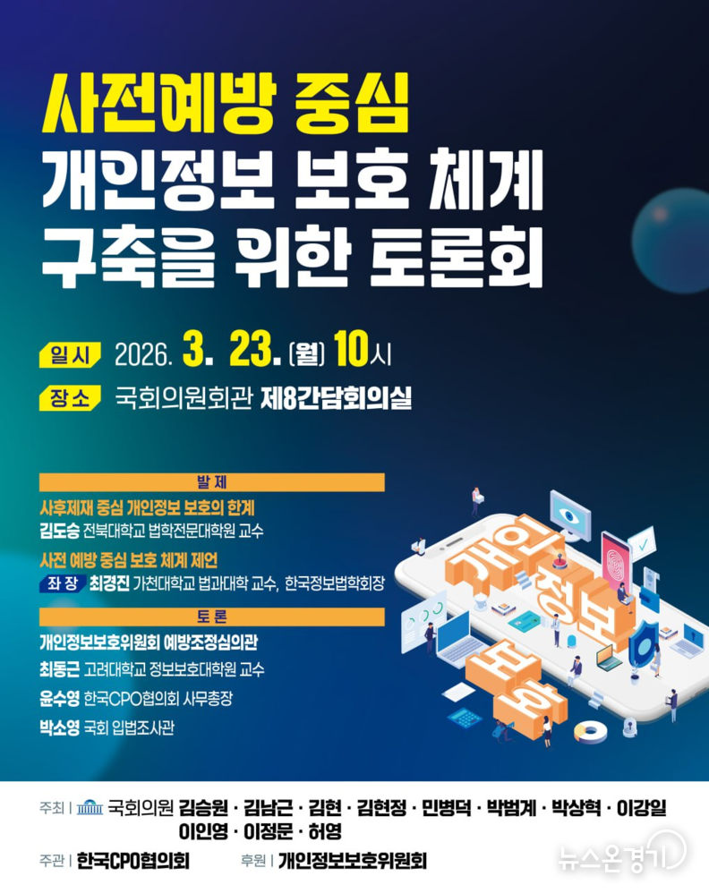 더불어민주당 김승원 국회의원(수원시갑·정무위원회)은 정보보호 체계 사전예방 중심 개편을 위해 23일 오전 10시 국회의원회관 제8간담회의실에서 「사전예방 중심 개인정보 보호 체계 구축을 위한 토론회」를 개최한다고 19일 밝혔다.
