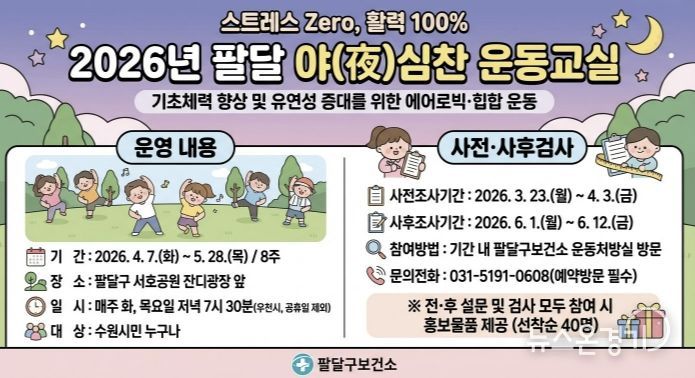 뉴스온경기 | 수원시 팔달구보건소가 시민들의 건강 생활 실천을 돕고 비만율을 낮추는 프로그램 ‘2026년 팔달 야(夜)심찬 운동교실’을 운영한다.