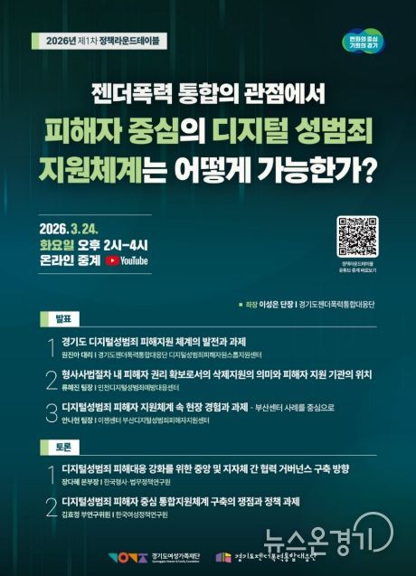 뉴스온경기 | 경기도와 경기도젠더폭력통합대응단은 24일 오후 2시 ‘젠더폭력 통합의 관점에서 피해자 중심의 디지털 성범죄 지원체계는 어떻게 가능한가?’라는 주제로 2026년 제1차 정책라운드테이블을 개최한다.